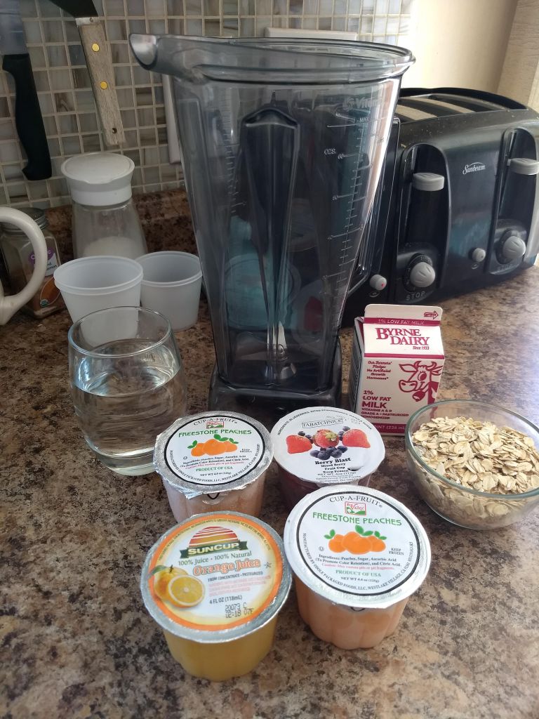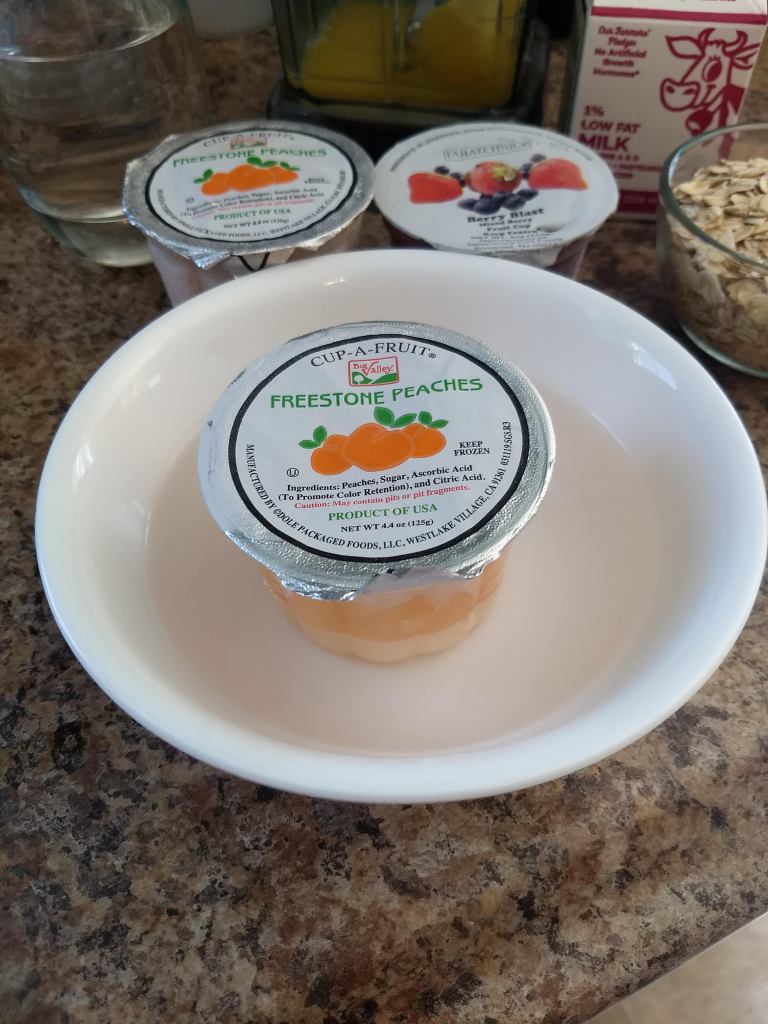 Whatever fruit cups or juice you get for the day…honestly doesn’t matter. I put them into the freezer and work from what we had yesterday. If you don’t want to wait a day, you can always use thawed and add in ice cubes instead of water. Comes out about the same.